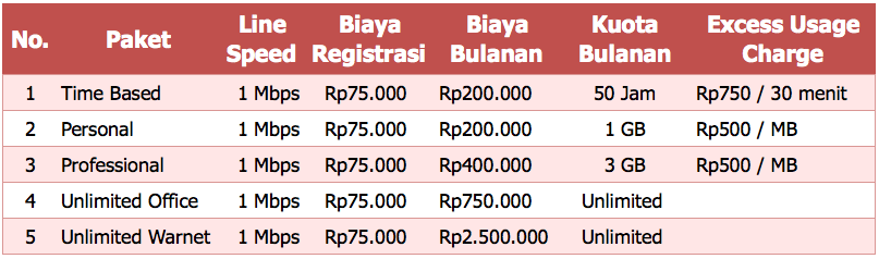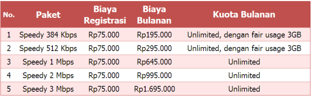 Dengan kecepatan 512 kb/s downstream dan 128 kb/s upstream Unlimited dengan fair usage 3 GB.